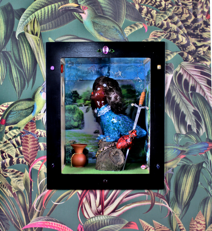 "the unquenchable thirst" 2026.Shadow Box size 27 x 33 x 22cm. Materials; wood, felt, feathers, cotton, paper, ceramic, stone, and glass.