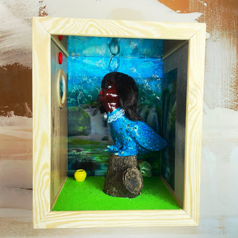 “All you desire”. 2026. Shadow Box. Materials; wood, felt, feathers, cotton, paper, ceramic, stone, and glass. 28W x 34H x 22D cm. ©SUNDIAGRAMS LLC.
